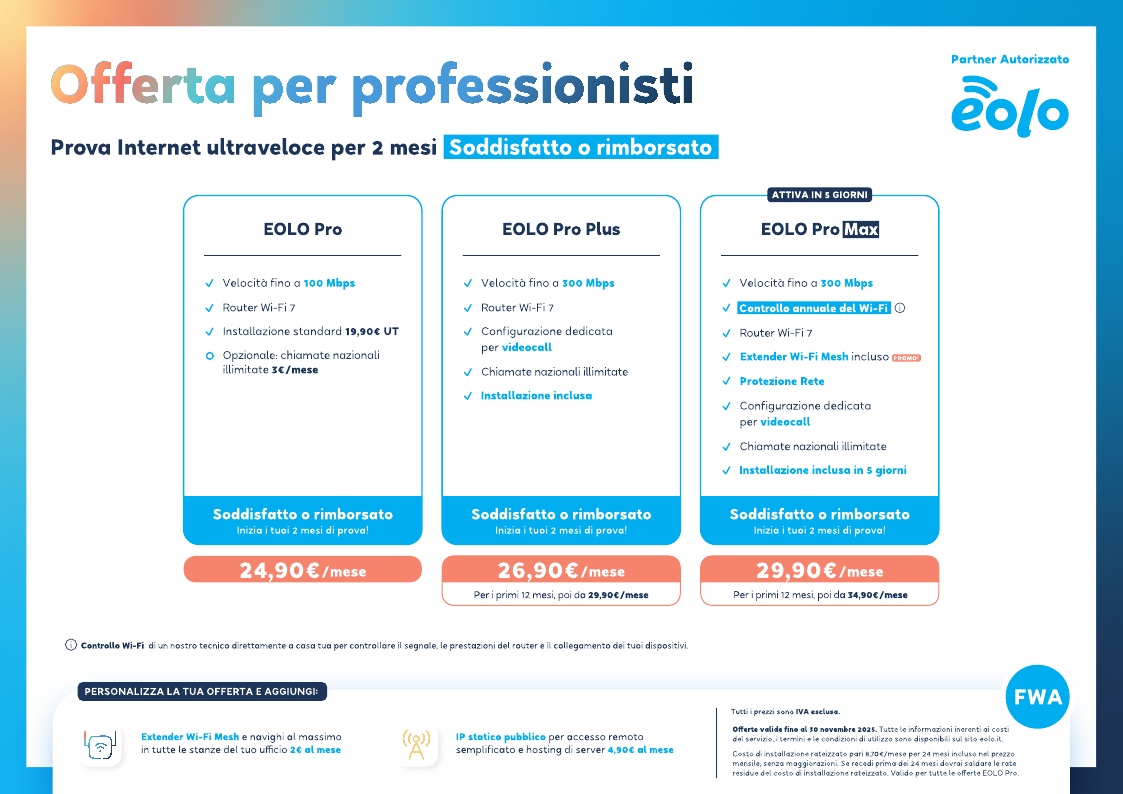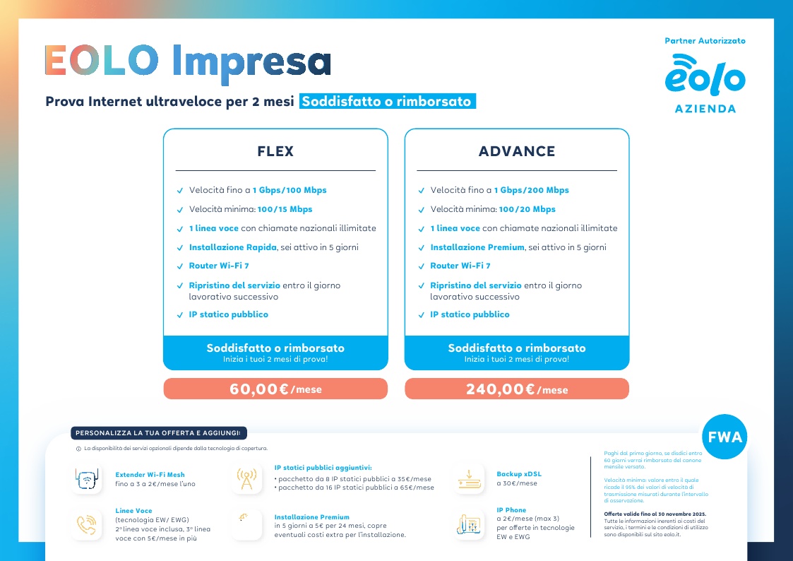 Si tratta di una linea a banda larga che ti permette di ottenere una connessione internet ultraveloce anche in zone non coperte dai servizi tradizionali quali adsl o fibra. I tecnici de La Casa Del Televisore sono a tua completa disposizione per qualsiasi consulenza in merito alle soluzioni Eolo: basterà l'installazione di una piccola parabola orientata verso apposite stazioni per accedere al network ed ottenere una connessione internet ultraveloce.